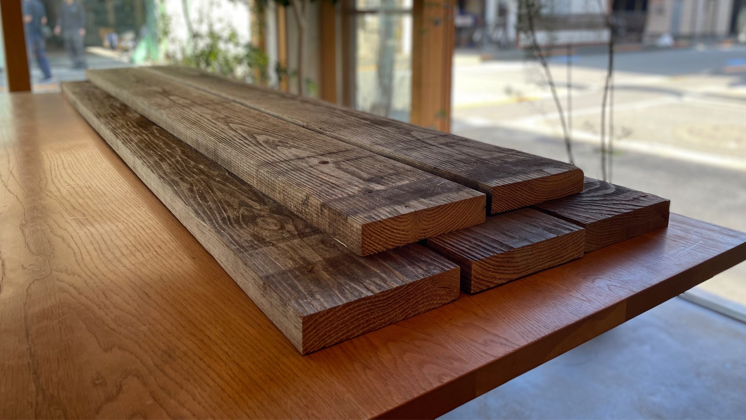 打ち合わせを重ねる中で、私たちが選んだ素材は、nojimokuの敷地で数年間雨ざらしにされていた無塗装の木材でした。