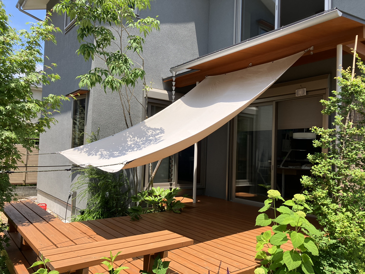 豊かな植栽に囲われた大工造作ウッドデッキ と お客様が工夫されて取り付けられたタープ