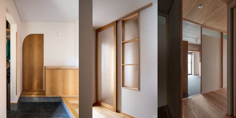 左:ナラ建具、中:框戸(ナラ框・半透明ポリカーボネート)、右:明り取り付き建具(シナに白塗装)
