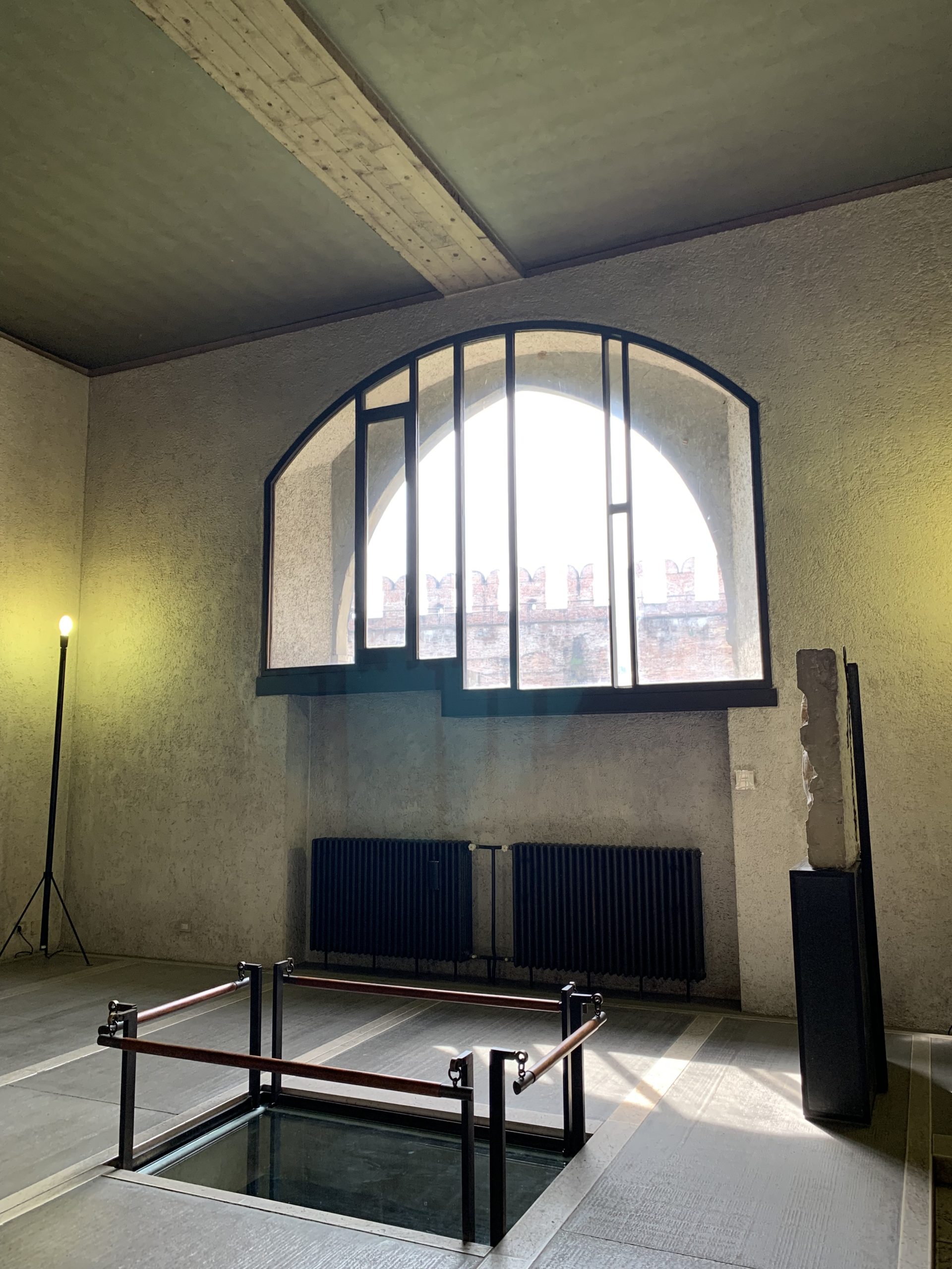 スカルパの改修の凄さは、新しい材料が元々の空間に違和感なく溶け込んでいるところです。それでころか、新しく挿入した材料が古い材料の良さを引き立てているようにさえ感じます。イタリアでは、この様な改修の仕事のことを「レスタウロ」と言います。これは単に直すというだけでなく、古いものの中に新しいものを付け加えて新旧の調和から価値を見出す創造的な修復という意味だそうです。スカルパは、まさにレスタウロという言葉の通りの仕事をしていると全身で感じました。