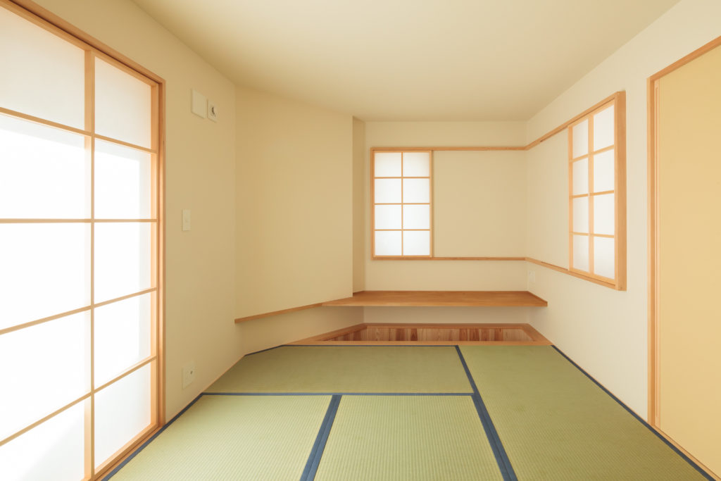 和室には、静かに本を読んだり、手紙を書いたりできる堀座卓と、光の線が意識された間接照明が「凛」とした空間を演出しています。