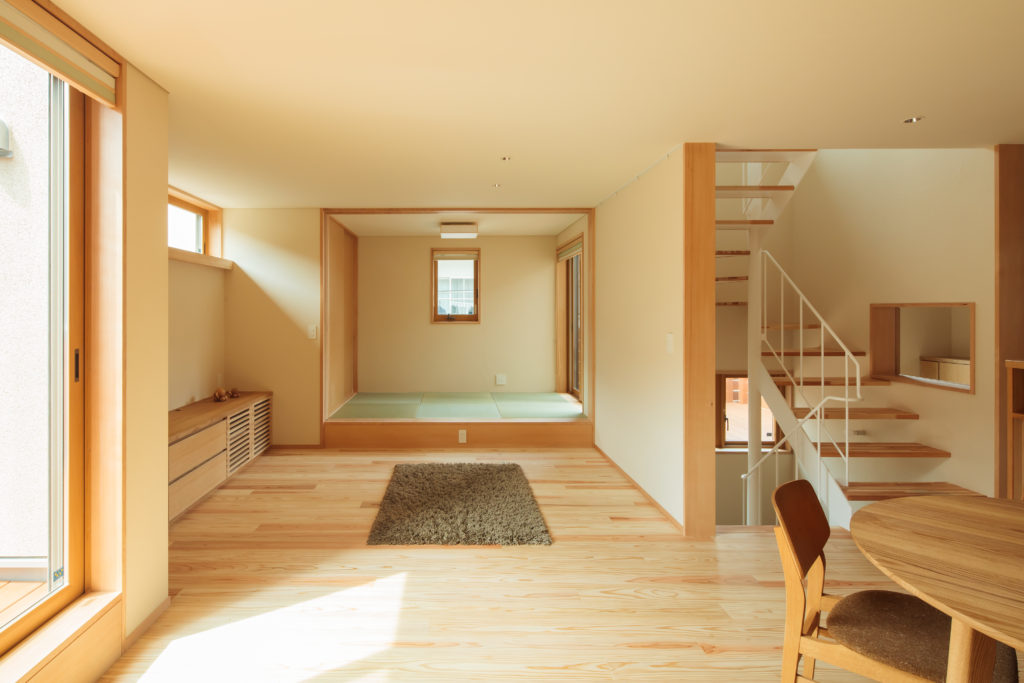 LDK・小上がり和室・北バルコニー・家事室・(LDK)の回遊動線は、家事はもちろん、お子様達もぐるぐる走り回って楽しそうです。(お子様に「この家どう?」と尋ねたら、「走りやすい!!」と答えてくれたのが印象的です。)