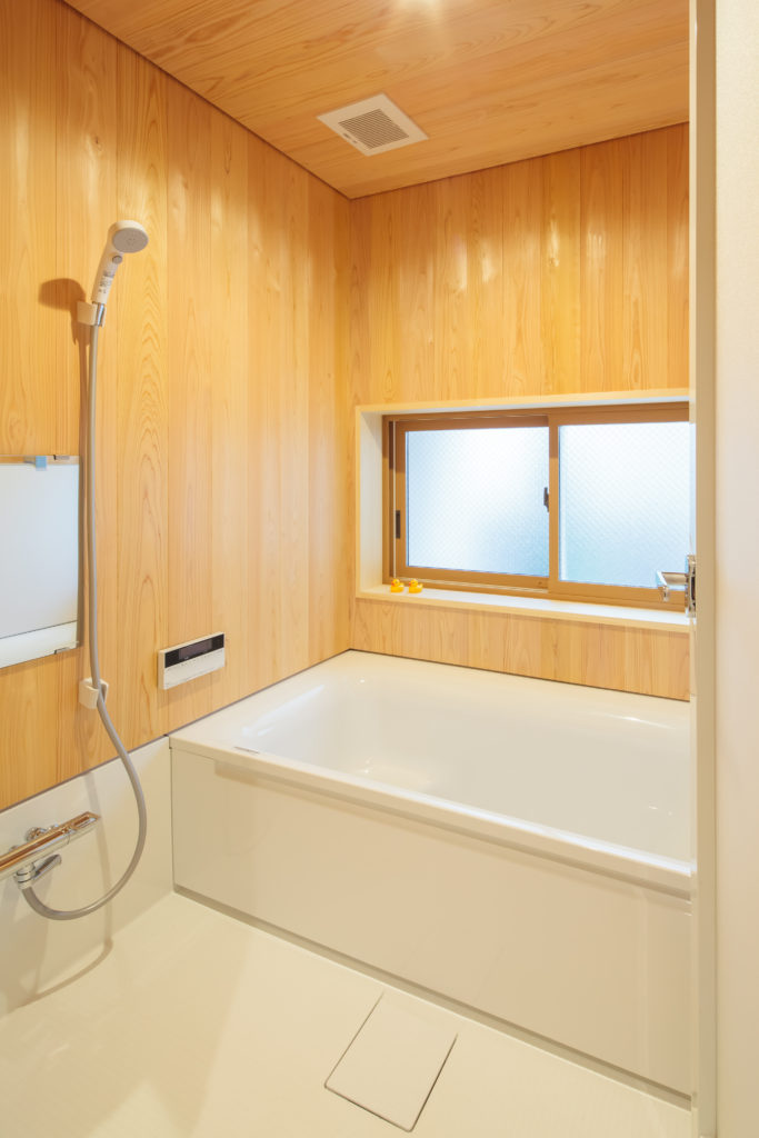 サワラの浴室の窓からは、ご主人が選ばれた椿を愉しむことができ、家族でにぎやかにお風呂に入られているのが目に浮かびますね。