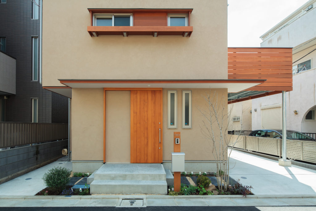 学園都市にある閑静な住宅街に、土壁色と木の建物と、緑の庭が迎えてくれる「笑顔つくる家」があります。ご夫婦とお子様の5人家族のお住まいです。