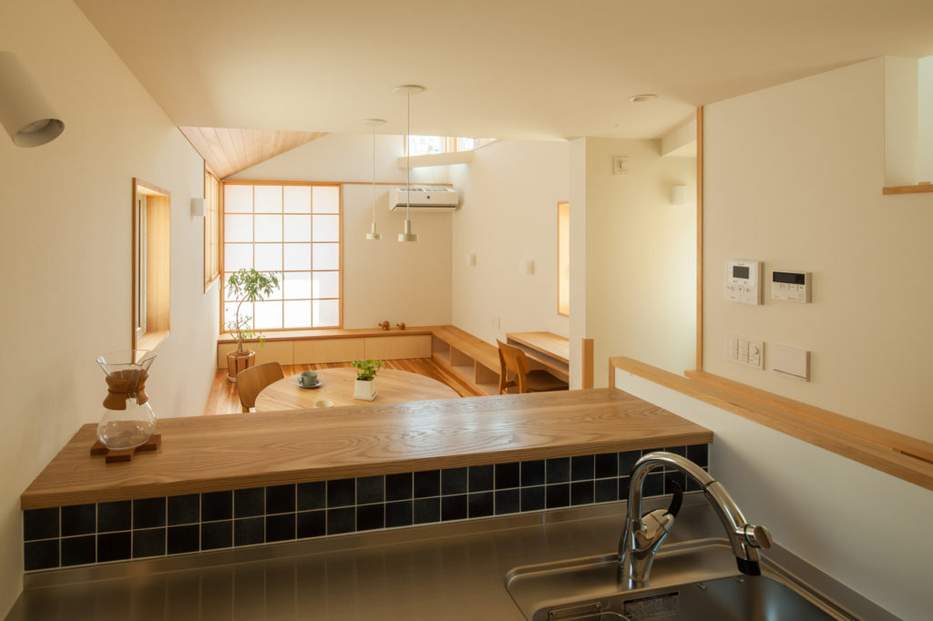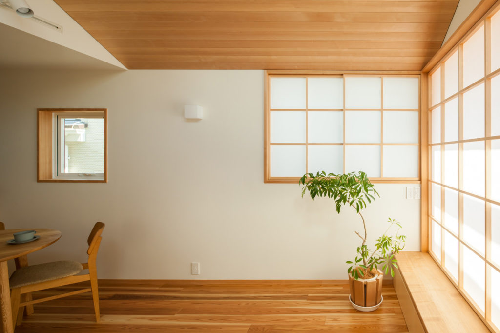 風そよぐ家 2階にLDKを配置し、南北で風が抜けるように計画をしています。 LDKは広々とした一体空間として、リビング上部は羽目板仕上の吹抜。 空間にメリハリをもたせています。 吹抜けのハイサイド窓からは空が見渡せ、採光も、風の抜けもたっぷりと取り込むことができました。 またLDKに面したバルコニーは、木製サッシを採用し、 デッキ敷きのバルコニーと木の温もりが連続する、贅沢な空間となりました。