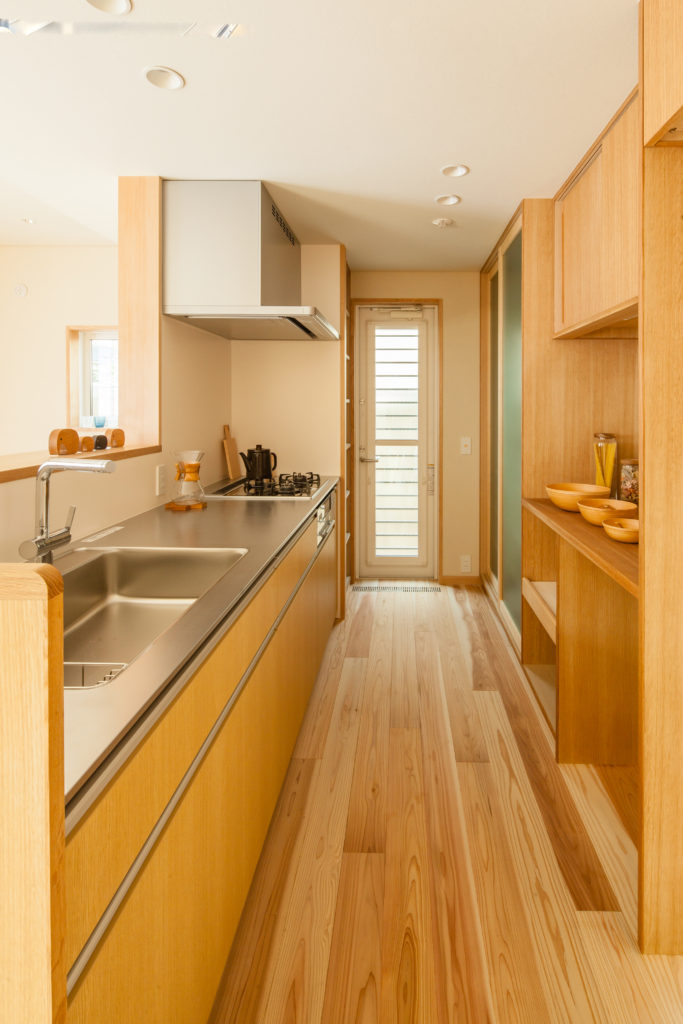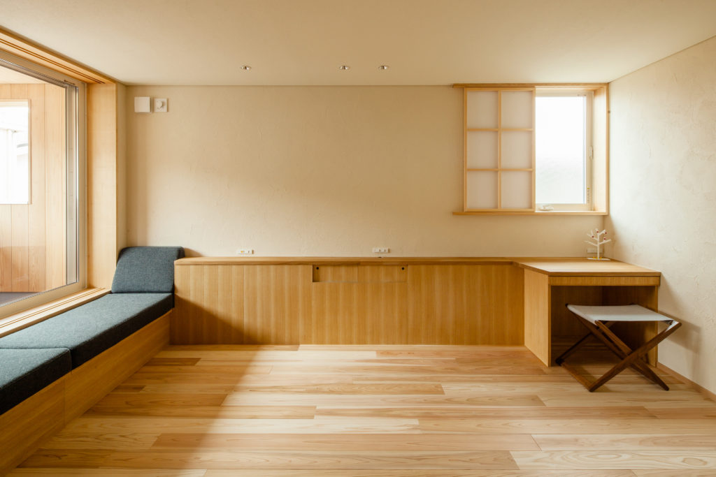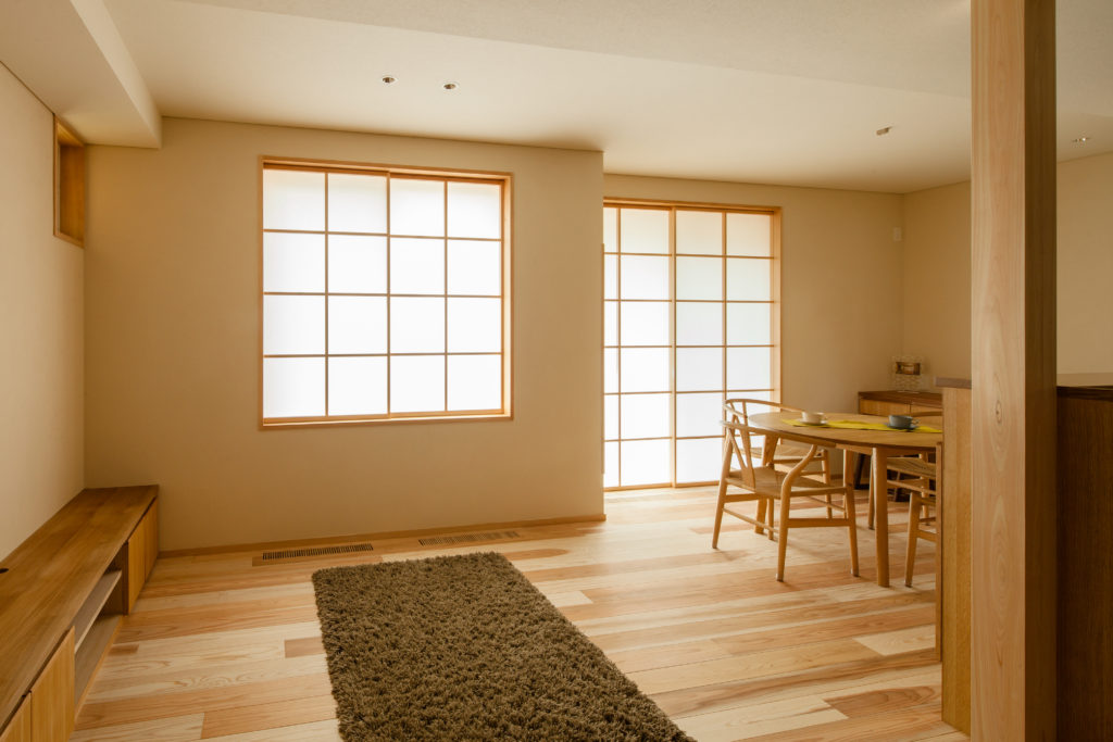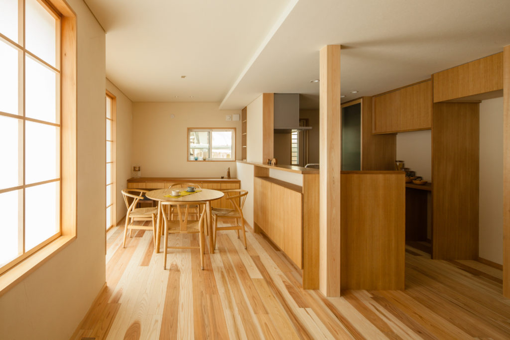 また、店舗内部にも高低差を作ることで、お店の中に変化と広がりを生むことができました。障子越しに差し込む柔らかな日差しが気持ちが良い1階のLDKは、シンプルにそして家族の距離感を大切にした配置にしました。