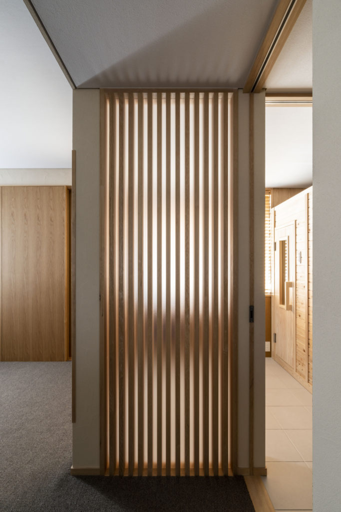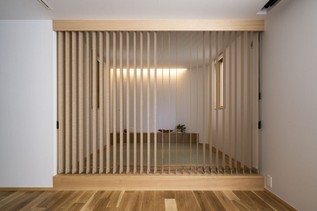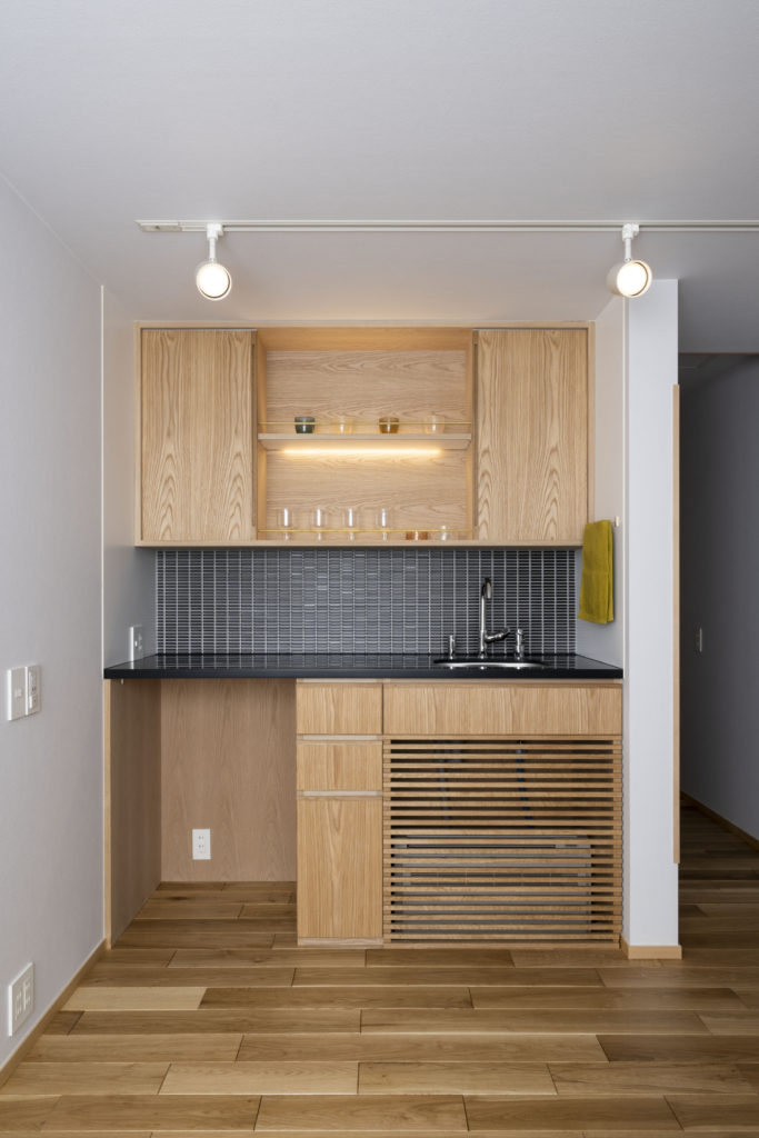 1階は寝室や趣味室など落ち着いた籠り空間となっています。趣味室には、バーカウンターや160インチのスクリーンがあり趣味を最大限に愉しむ空間となりました。お気に入りのグラスやお酒を照らす収納は、お施主さまからのアイディアでした。映画を見ながら、お酒をつくるひとときが愉しみになりますね。