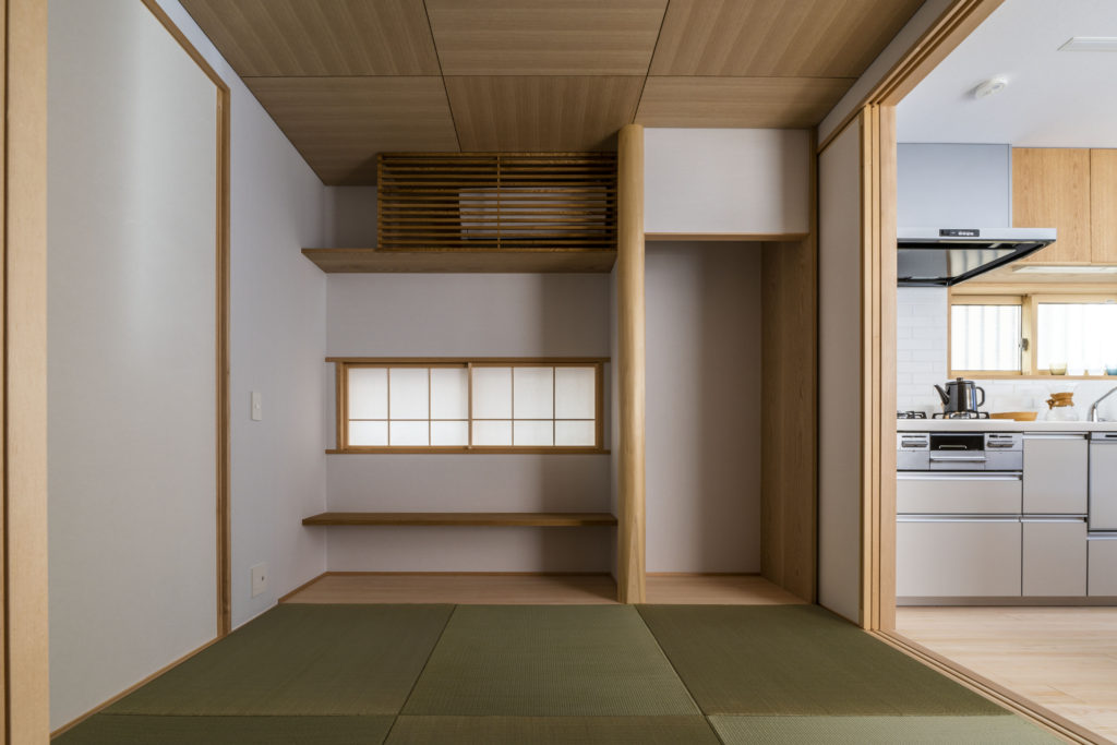 寝そべりながら空を見上げて過ごせる造作ソファのあるタタミリビングに、カウンターデスクを併設したダイニング、家族それぞれがくつろげる居場所ができました。タタミリビングは建具で閉じることもでき、来客時も対応できます。