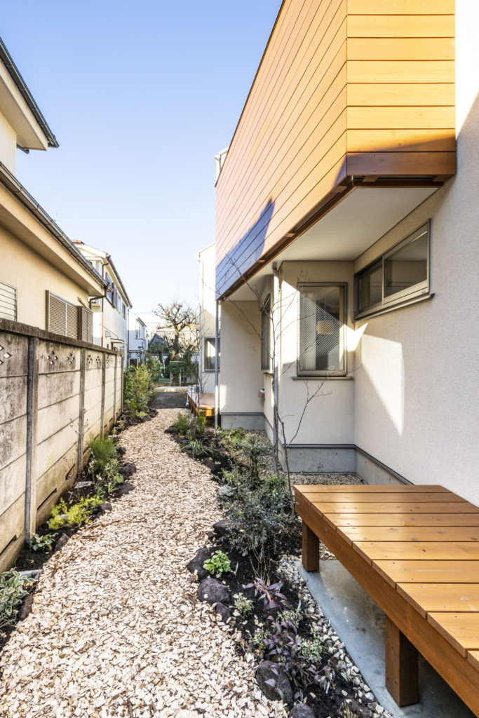 敷地形状をうまく利用した小路のような植栽計画は四季の移り変わりを愉しめる住まい手お気に入りの場所となりました。