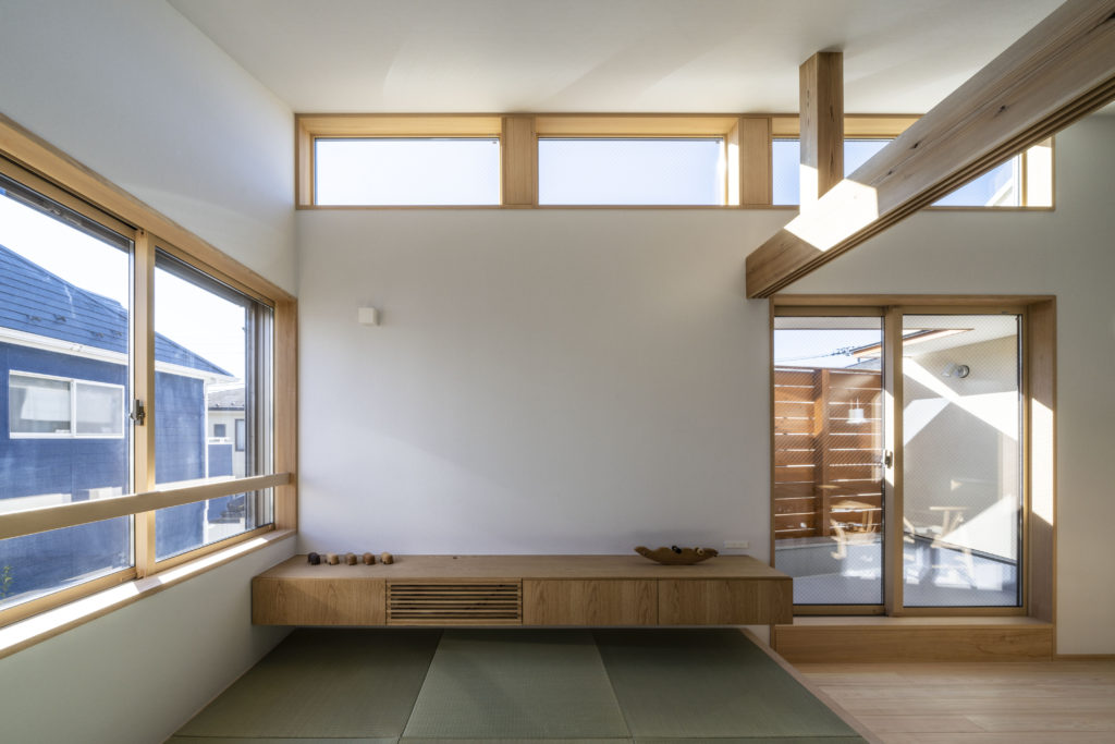 2階・子世帯は子育てやリモートワーク等、これからの暮らしを見据えた空間計画をしています。LDKは、広がりを感じられる勾配天井となっており、高窓から空と光を愉しむ空間になりました。