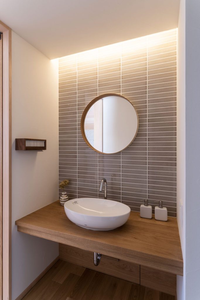家具はなるべく線を少なくすっきりと。タイルは彩度を抑えた落ち着いたカラーで、贅沢に天井まで張りあげています。照明も、空間演出の為に、間接照明を所々に配置。全てのお部屋を、雰囲気のある大人な空間を意識してしつらえました。