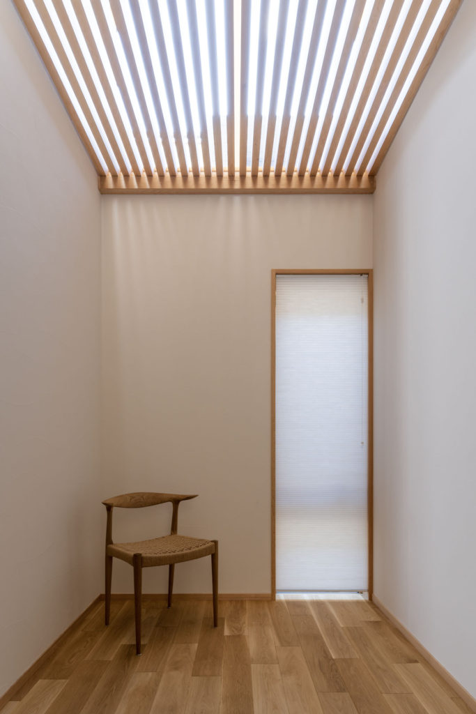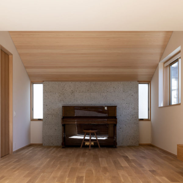 2階リビングは板張りの勾配天井と大谷石のアクセント壁で構成され、特別な場所になりました。ピアノを弾きながら、音楽の流れる時間を愉しむことができます。反対側のフルオープンの窓を開けると、外空間をとても近くに感じることができます。